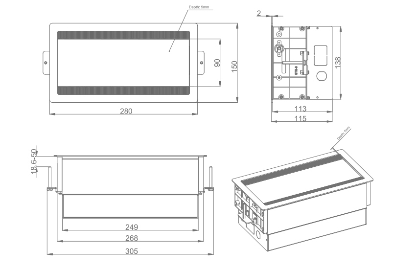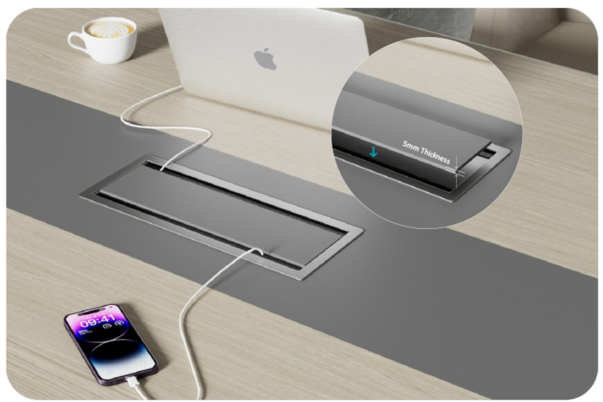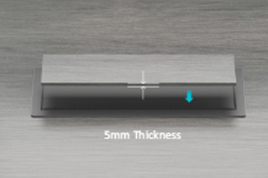 The product features a double-sided flip-up cover, with each side opening up to 90 . When closing, the cover is damped and descends slowly. The panel flips open easily, providing better access to outlets from either side, creating a more functional and organized desk .