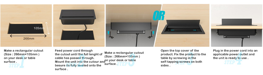 The flip-up cover with can be opened 90 , and When closing, it is damped and descends slowly. The cover panel easily flips opens providing better access to multiple outlets , creating a more functional and organized desk .